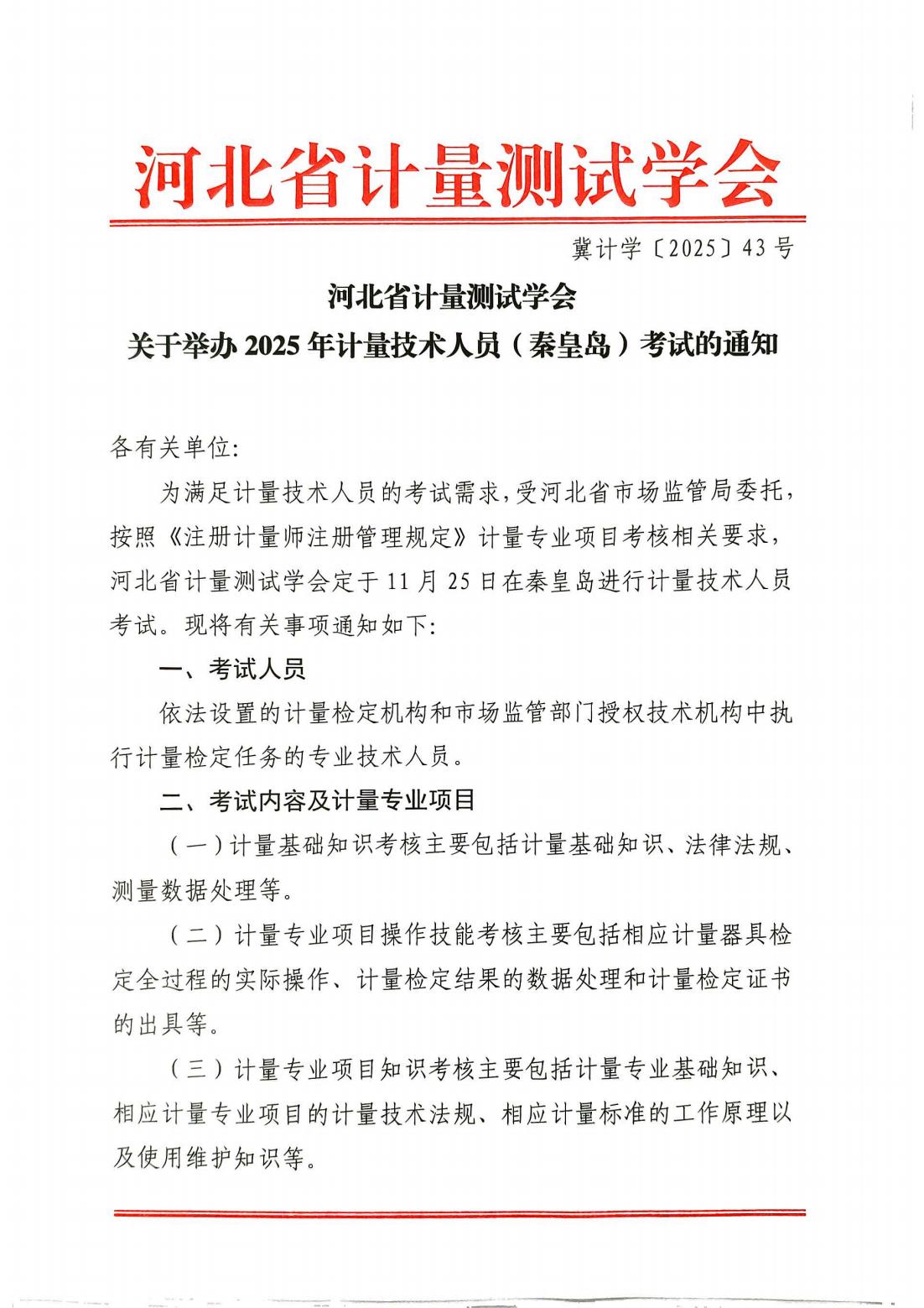 河北省计量测试学会 关于举办2025年计量技术人员(秦皇岛)考试的通知